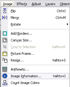 Lasertulostus 100-200 ppi Mustesuihkutulostus 150-200 ppi Aikakausilehdet 200-266 ppi Sanomalehdet väh. 300 ppi Paint Shop Pro:ssa saat aktiivisesta kuvasta em. tiedot valitsemalla työkaluvalikosta Image --> Image information...