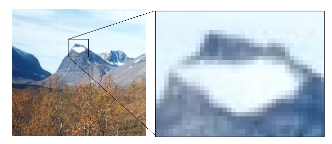 Esimerkissä suurennettu (13:1) kohta kuvasta jossa pikselit erottuvat selvästi.